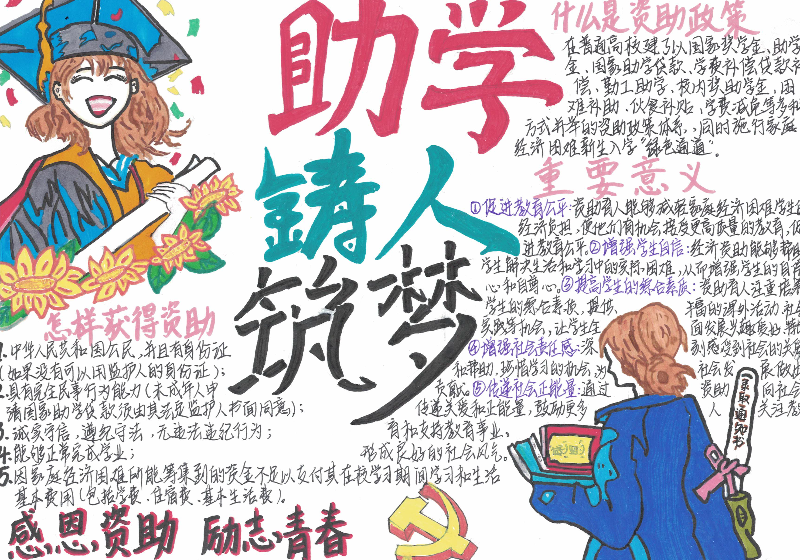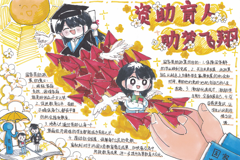 为了全面深入地宣传国家资助政策,引导我院全体学生树立正确的价值观与人生观,2024年5月2日至2024年5月11日,我院举办“学生资助政策宣传月”之资助育人手抄报活动,我院全体学生参与。