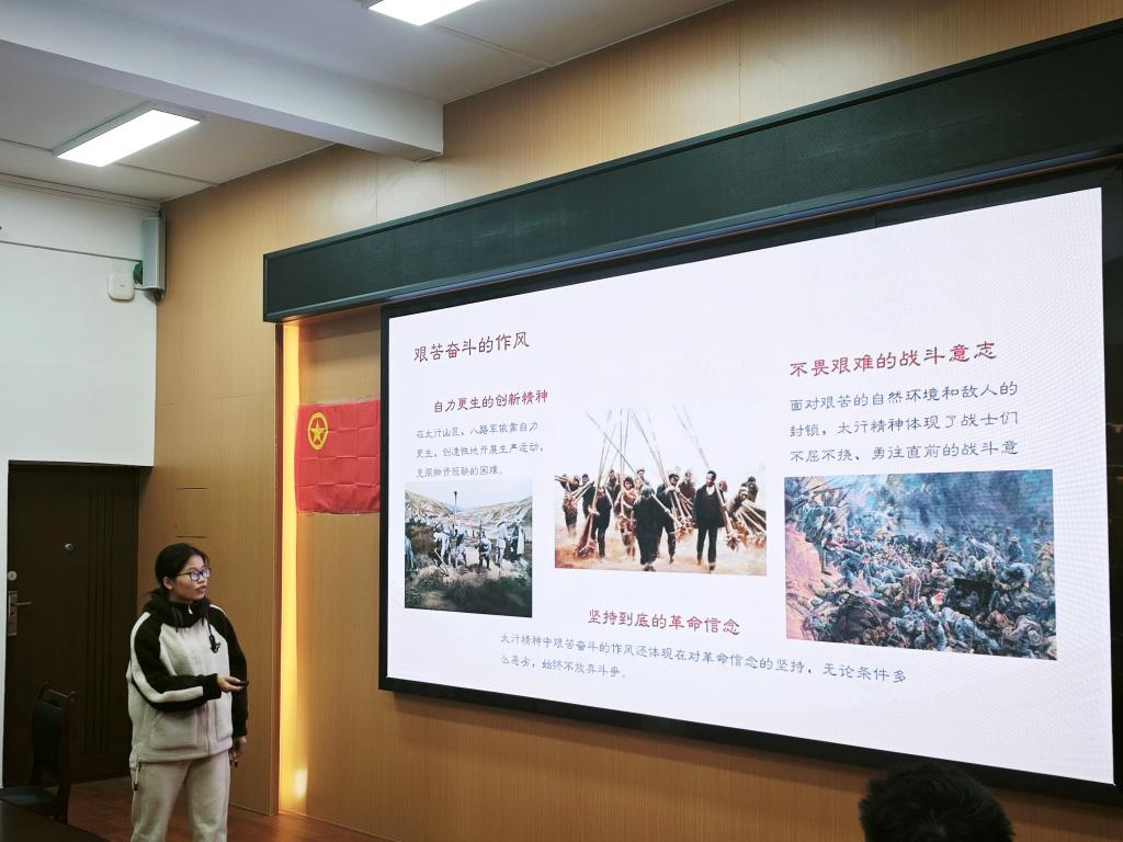 宣讲会开始,杨思莹以生动的语言和丰富的历史资料,对“太行精神”与“‘两弹一星’精神”展开深入解读。她指出,太行山区军民展现出的不怕牺牲、英勇斗争精神的伟大内涵,这种精神在当今时代对于激励人们克服困难具有不可替代的价值。蔡云韵以“发扬‘三牛’精神,书写时代新答卷”为主题进行宣讲,她指出,“三牛” 精神,即为民服务孺子牛、创新发展拓荒牛、艰苦奋斗老黄牛精神的内涵与要义,呼吁学生干部们在实践中发扬“三牛”精神。蒙莉莉聚焦“载人航天精神”,详细回顾了中国载人航天事业从艰难起步到逐步壮大的艰辛历程,讲述了几代航天人白手起家、勇攀高峰的故事。这种精神将持续鼓舞全体中华儿女在科技强国与民族复兴的道路上奋勇前行,不断追求卓越。